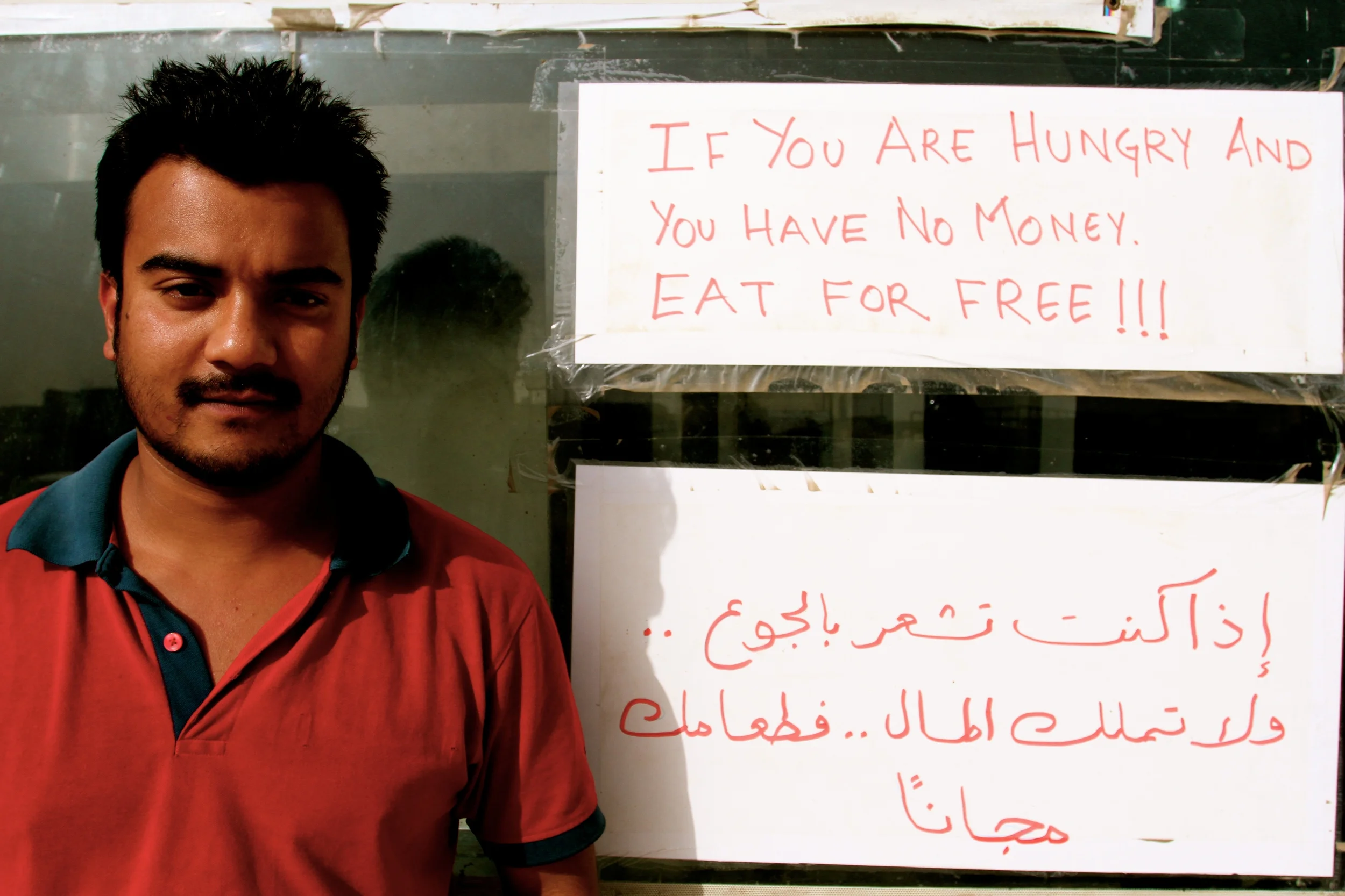 Two cardboard signs are taped to the front window – one written in English and one in Arabic. They say: ‘If you are hungry and you have no money, eat for free.’